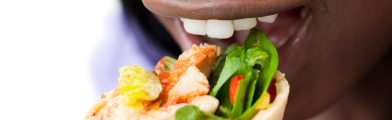 Photo: Woman taking a bit of a crispy chicken wrap