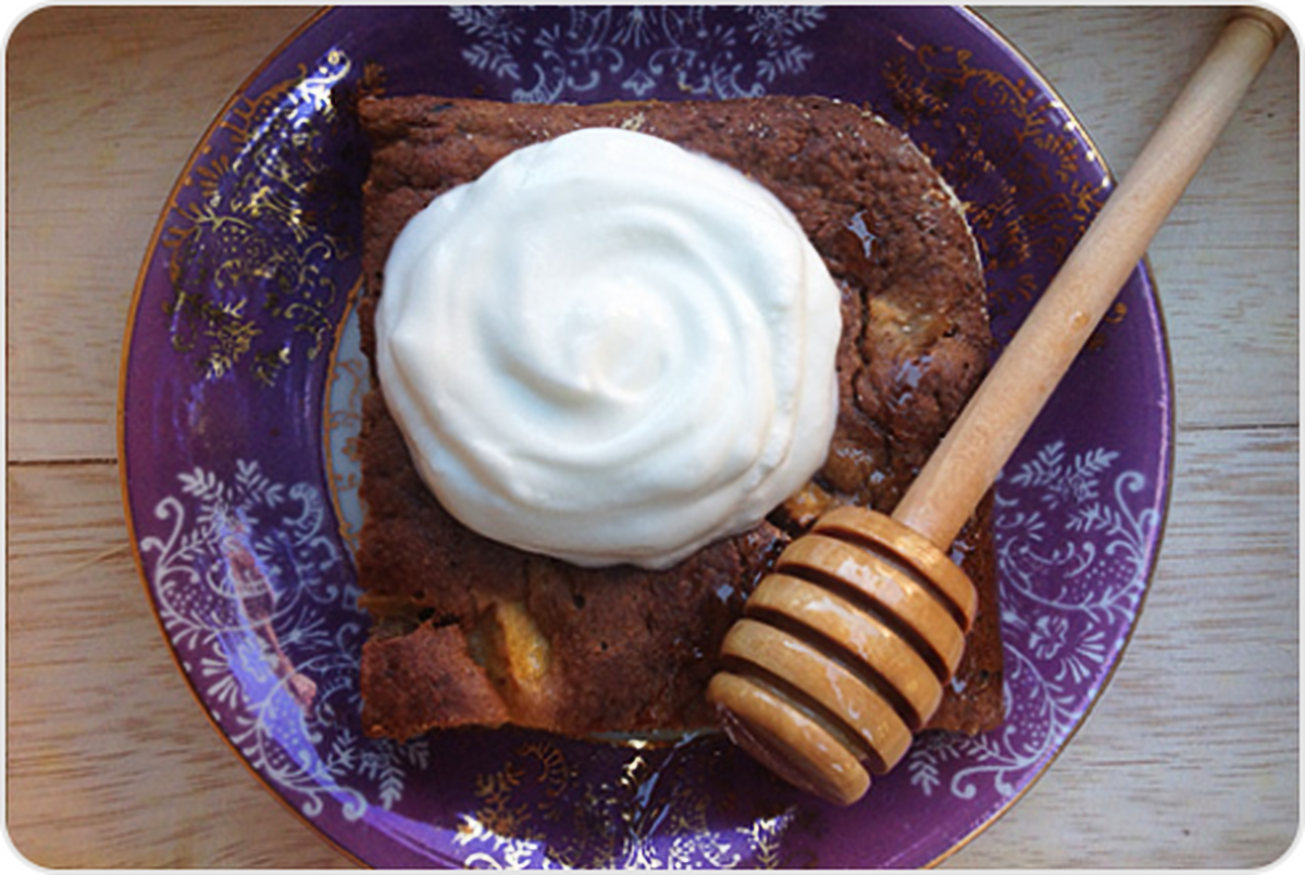 6. Combine wet and dry ingredients until just combined and stir in peaches. Transfer to a baking dish, and bake in the oven for an hour. Remove from heat and cool before eating. Serve with honey and Greek yogurt, optional.
