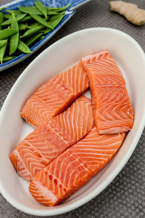 - Wash the salmon and pat it dry. Pour the reserved chile mixture into the remaining prepared baking dish and place the fish skin-side up into the dish. Bake for 8 minutes. (Vegetables will continue to roast on a separate rack.)