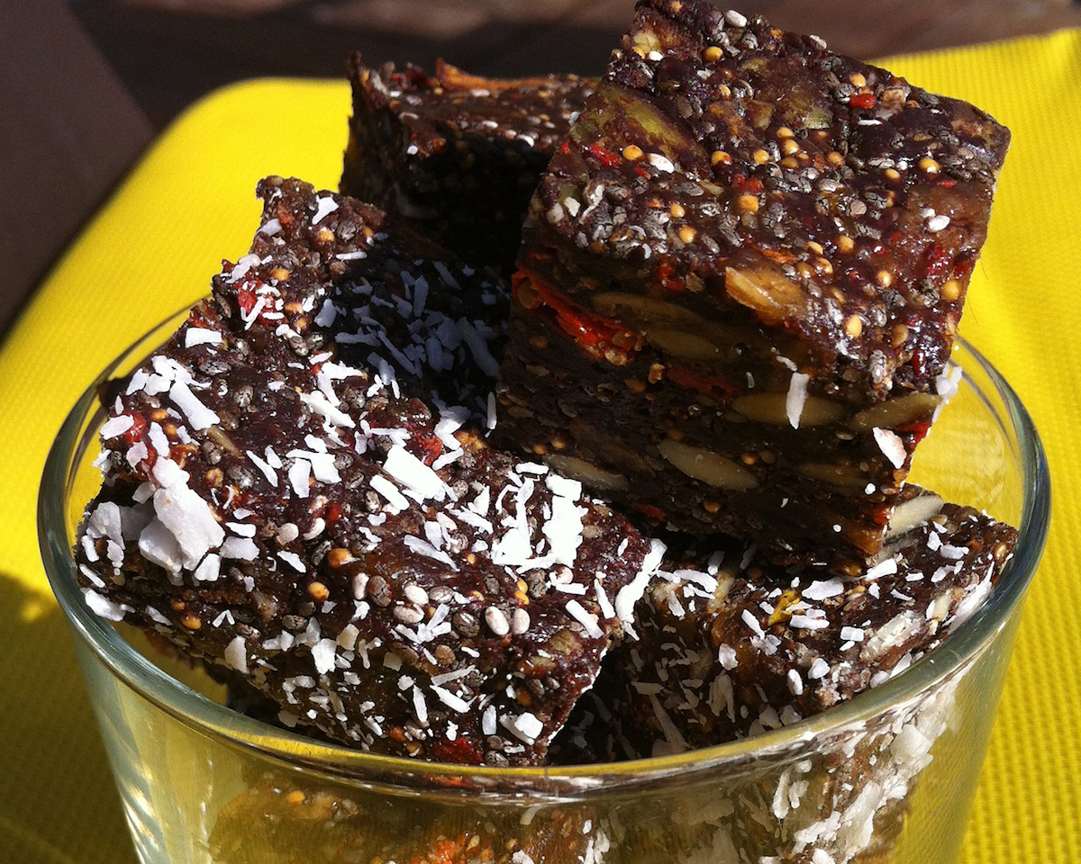 - In a food processor, puree dried figs into a thick paste. Pulse in dried apricots, chia seeds, unsweetened cocoa, orange zest, and goji berries (if using) until fully combined.
